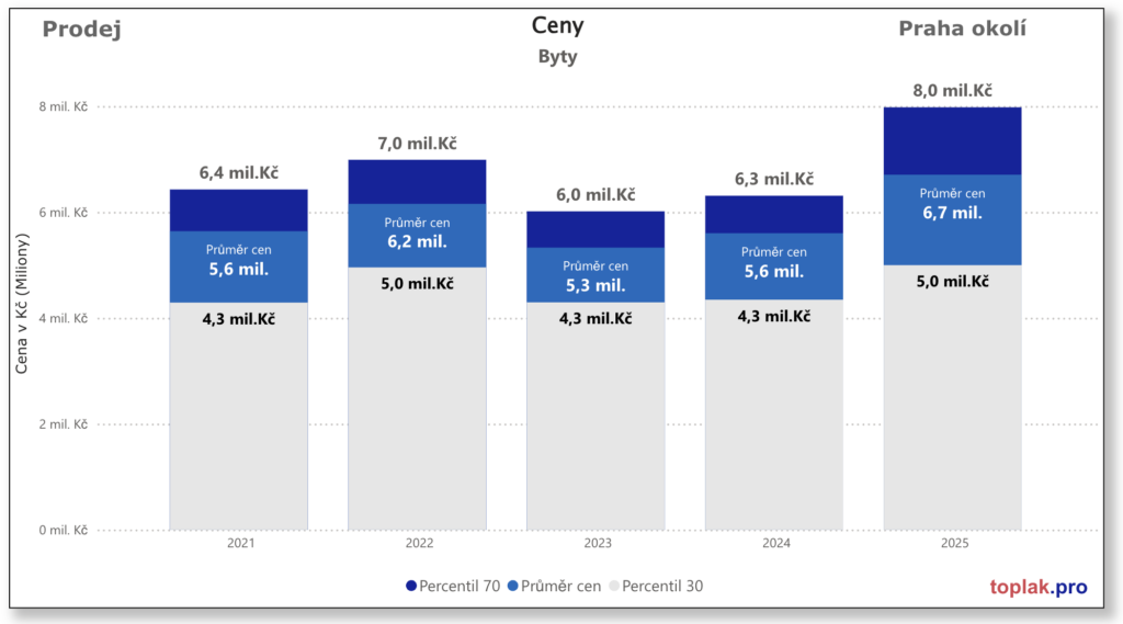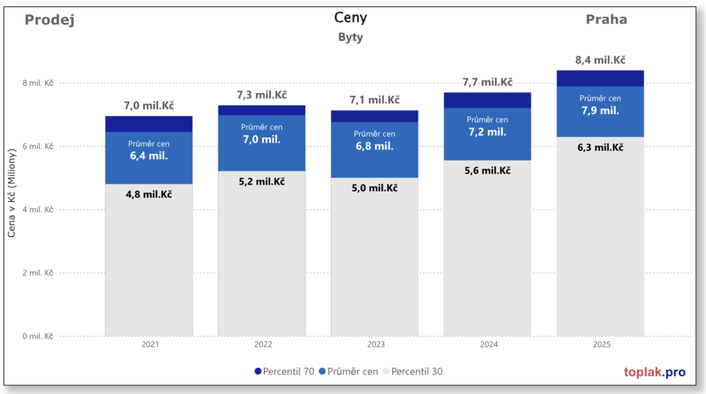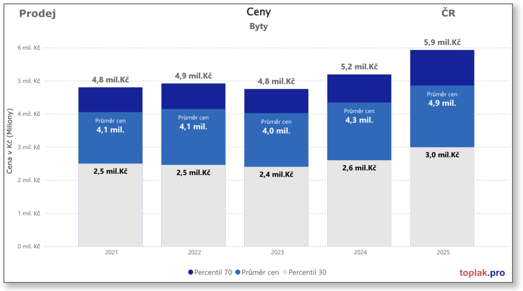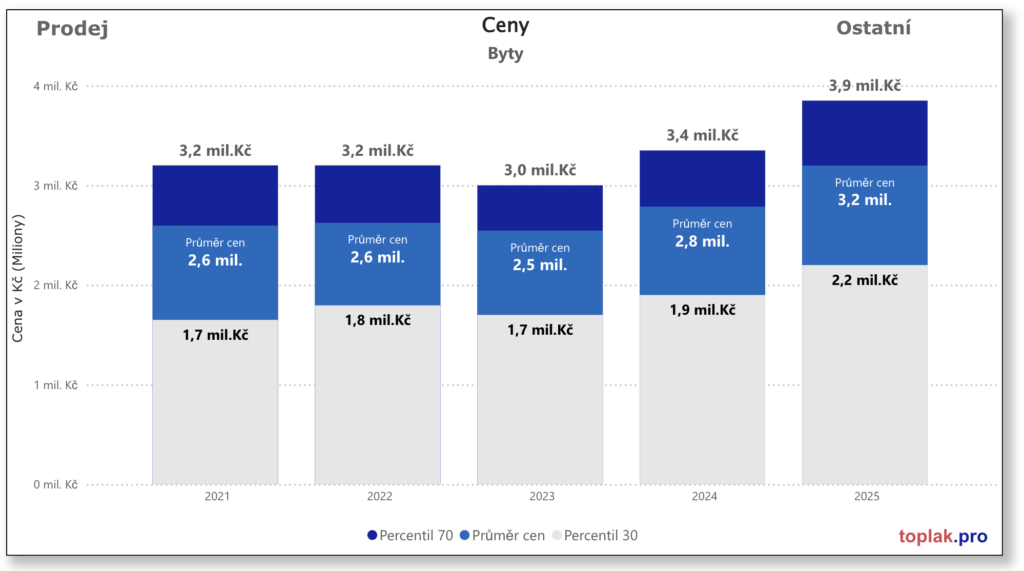 V celorepublikovém měřítku se spodní třetina bytů od roku 2022 posunula zhruba z 2,5 milionu korun na 3 miliony korun, tedy o přibližně 20 %. Podobným tempem rostly i průměrné ceny, které se zvýšily z 4,1 na 4,9 milionu korun. Horní cenový segment zaznamenal růst z 4,9 na 5,9 milionu korun. Jinými slovy, růst není tažen jen luxusními nemovitostmi, ale týká se celého trhu.
