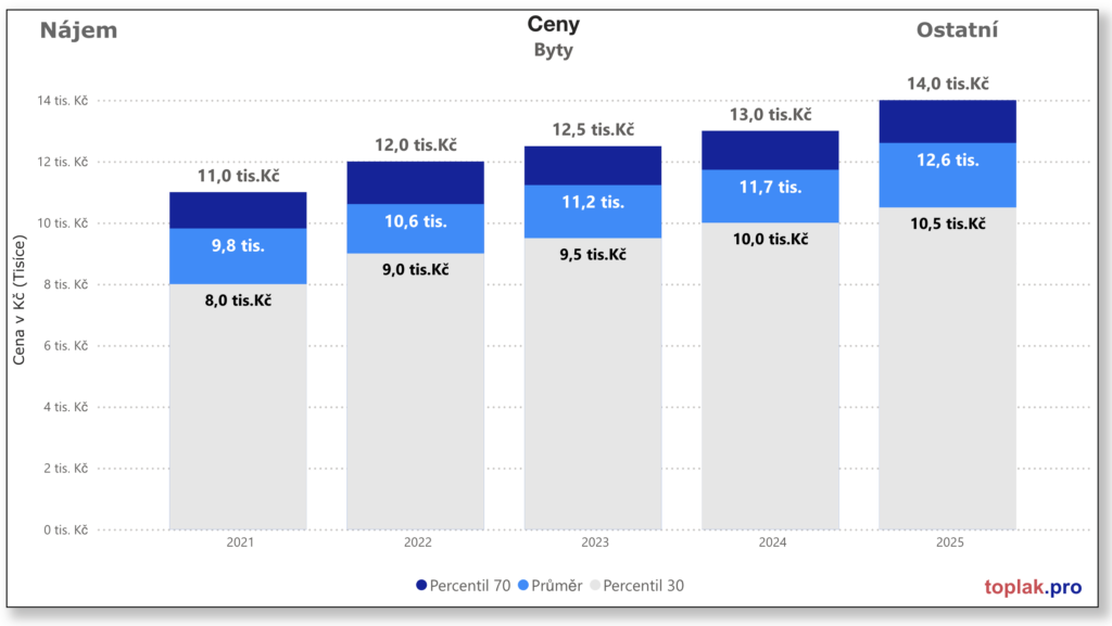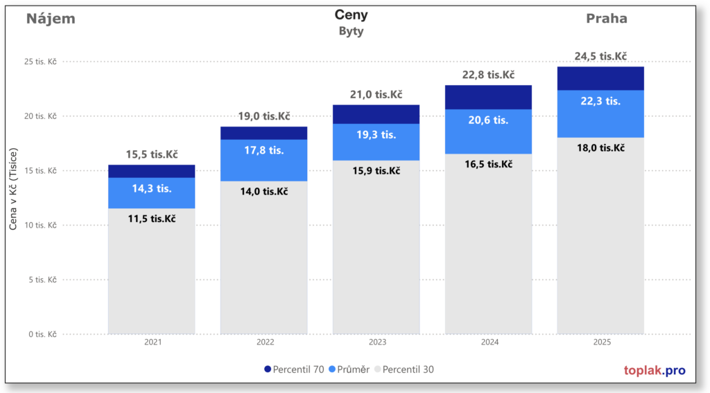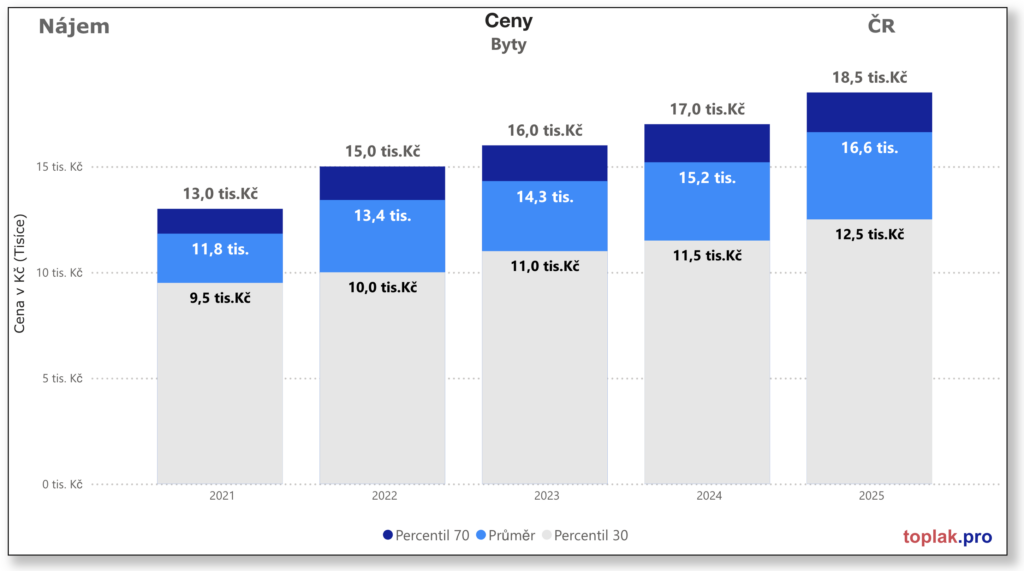 V celorepublikovém průměru se nájem bytu za poslední tři roky zvýšil z 13 400 korun na 16 600 korun, tedy o zhruba 3 200 korun měsíčně. V Praze je růst výraznější. Průměrné nájemné zde vzrostlo z 17 800 na 22 300 korun, přičemž horní třetina nájmů se pohybuje nad hranicí 24 500 korun. Spodní třetina naopak zůstává pod 18 000 korun, což ukazuje na poměrně široké rozpětí cen i v rámci jednoho města.