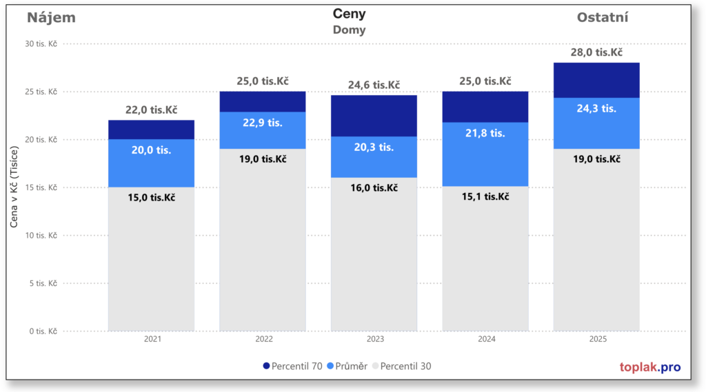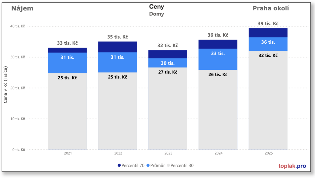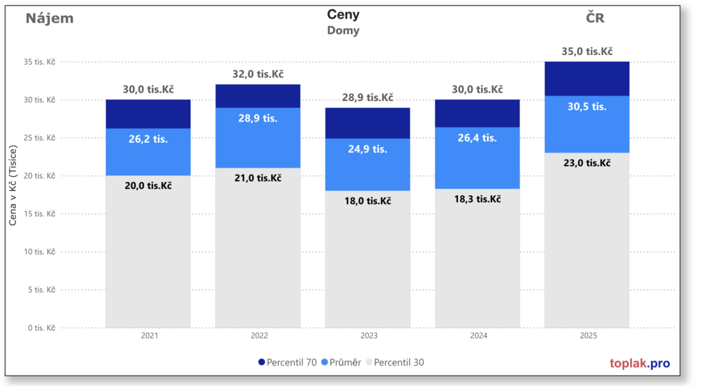 V celorepublikovém průměru se nájem rodinného domu pohybuje kolem 30 500 korun měsíčně. Horní třetina trhu se dostává nad 35 000 korun, zatímco spodní třetina zůstává pod hranicí 23 000 korun. Ve srovnání s rokem 2022 jde o nárůst zhruba šesti procent.