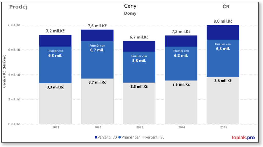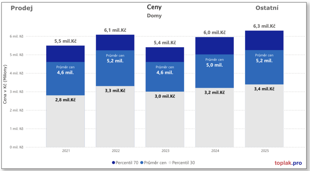 V ostatních regionech zůstávají ceny domů velmi podobné úrovním z roku 2022. Horní cenový segment se zde posunul jen mírně, zhruba z 6,1 na 6,3 milionu korun, zatímco spodní segment zaznamenal jen nepatrné posílení. Tyto oblasti přitom tvoří přibližně dvě třetiny všech prodejů rodinných domů v České republice. Celkově tak u domů nejde o cenový boom, ale spíše o stabilizaci po předchozích poklesech.