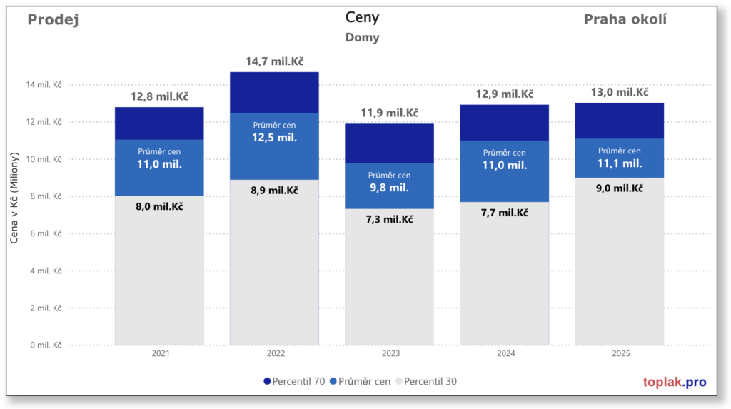 Nejvýraznější korekce proběhla v okolí Prahy. V roce 2022 zde dosahovaly ceny rodinných domů vrcholu kolem 12,5 milionu korun, zatímco dnes je průměrná cena zhruba o 1,4 milionu korun nižší. Horní segment zde zaznamenal výraznější zlevnění, zatímco levnější domy spíše stagnovaly nebo mírně zdražily.